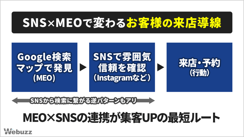 どちらのパターンでも、「SNS→MEO」「MEO→SNS」の連携がスムーズでなければ、お客様は離脱してしまいます。